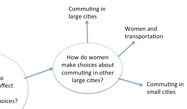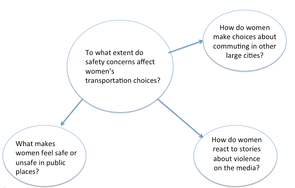 安全に対する懸念は、ジャカルタのような大都市で女性が交通手段を選択する際、どの程度の影響を及ぼすか この課題につき、スパイダー・ダイアグラム(情報を整理し線画などで幾何学的に図示する手法、以下の図参照)を作成して、派生する質問を作成し、検索の範囲を広げていきます。派生する質問への回答が、根本的な質問の回答につながるように質問を考えます。