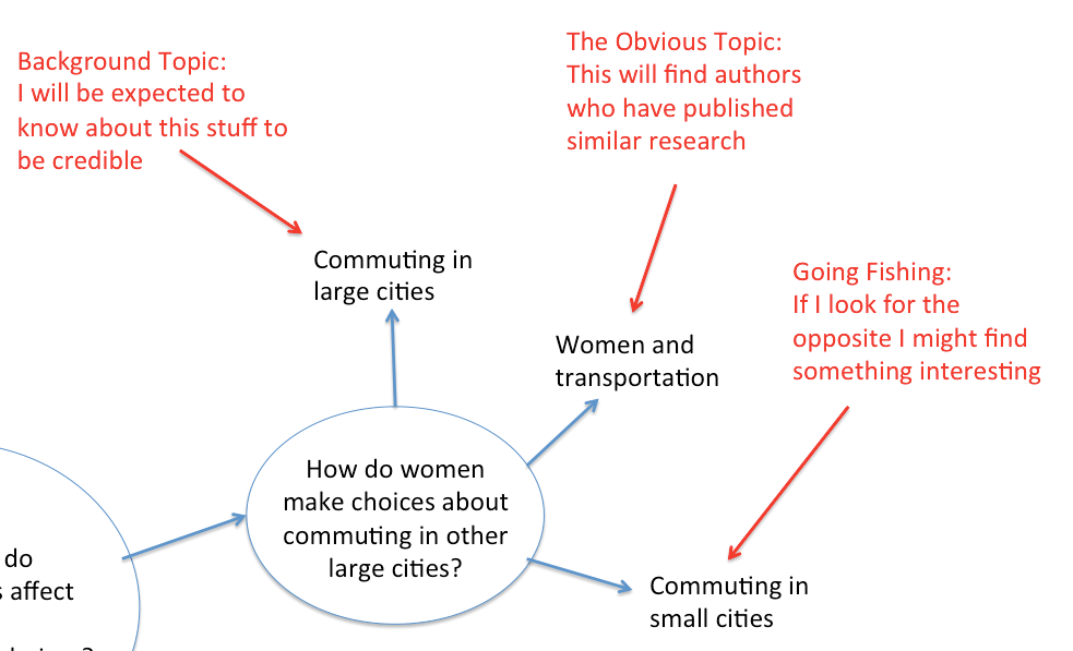 ここで「大都市での通勤」を背景題目(background topic)と位置付けます。これを検索に使うと文献が見つかる可能性が高まり、同じ分野の研究者からの信頼も得やすいと考えるものです。2つ目の「女性と交通」は明瞭題目(obvious topic)と位置付けます。この語句をキーワードにすれば類似の題目を対象にしている研究者を見つけることができるでしょう。3つ目の「小都市での通勤」は、私がひっかけ題目(going fishing topic)と呼んでいるもので、意図的に反語を検索に入れ込むことで、今まで見落としていた何か面白いものが引っかかるかもしれないという期待を込めています。釣り竿を垂らしたら魚が引っかかった!と喜ぶようなものです。これは、体系的な創造性を意図的に行動につなげることの一例です。 以下が実際に学術論文検索用エンジンGoogle Scholarで‘women and transportation’を検索してみた結果です。