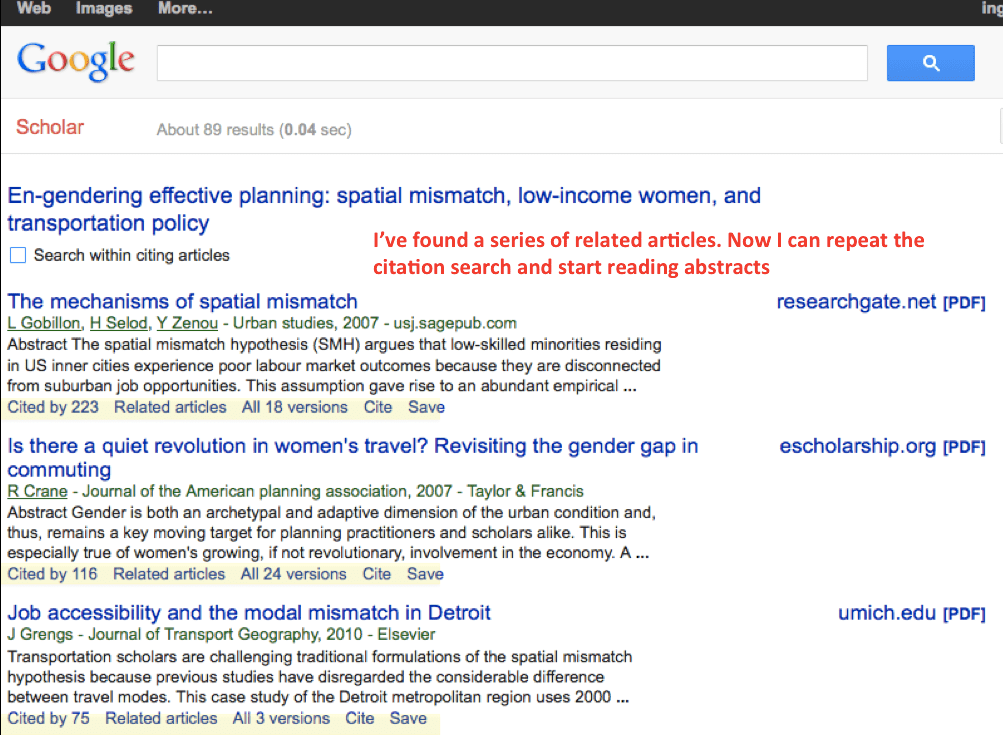 すべての表示は予想どおり関連した題材ですが、最後に表示された“En-Gendering Effective Planning: Spatial Mismatch, Low Income Women And Transportation Policy(仮訳:新たに作成される効果的な計画:空間的不一致、女性の低所得、交通政策)”には興味を惹かれます。画面コピーでは見づらいですが、重要なのはハイライトを付けた引用数です。引用数が多いことは、この記事が役に立つと思われていることを示しています。一般的には、引用数が多いほど影響力も多いと考えられるため、引用検索は、該当文献の影響力を評価するのに最適な基準のひとつです。とはいえ、多くの人が異議を唱えるような場合や、不正に引用されているような場合などでも該当論文の引用数が多くなることは留意しておく必要があります。