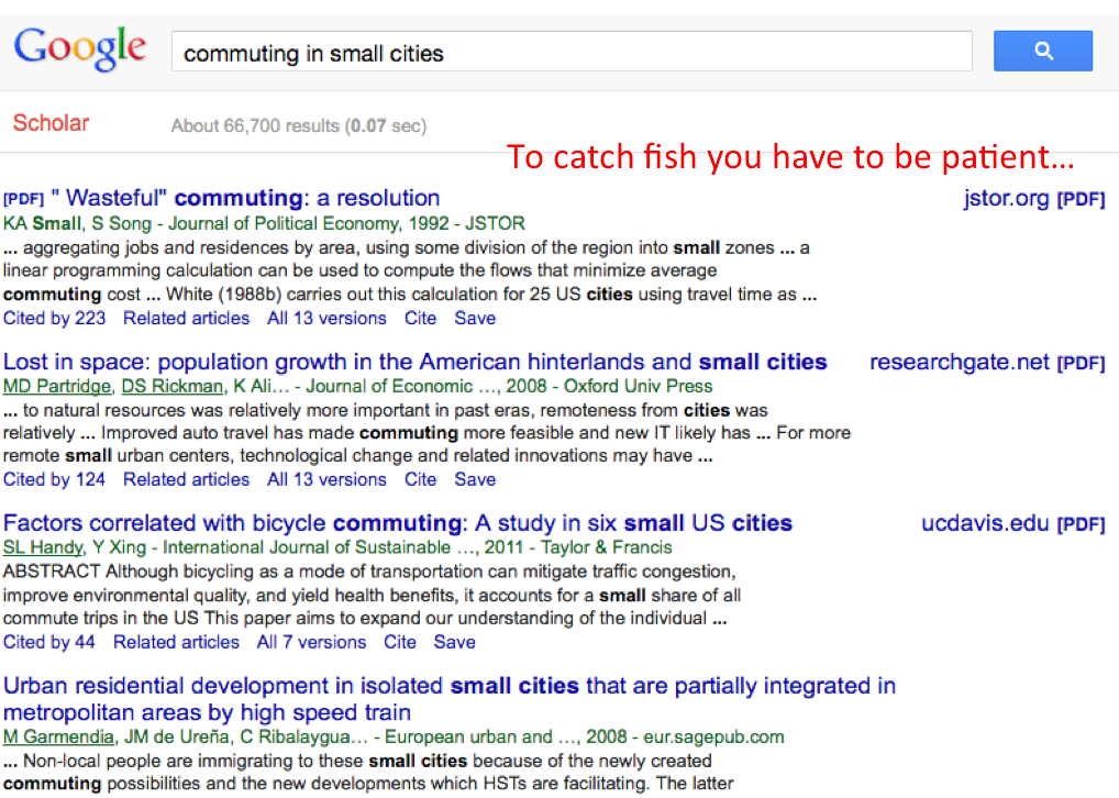 この論文をさらに探ってみると、私の研究プロジェクトに役立ちそうな記事が表示されました。 最後に‘commuting in small cities’で「ひっかけ」検索もやってみます。その結果、以下の私の研究とは反対のことが表示されました。