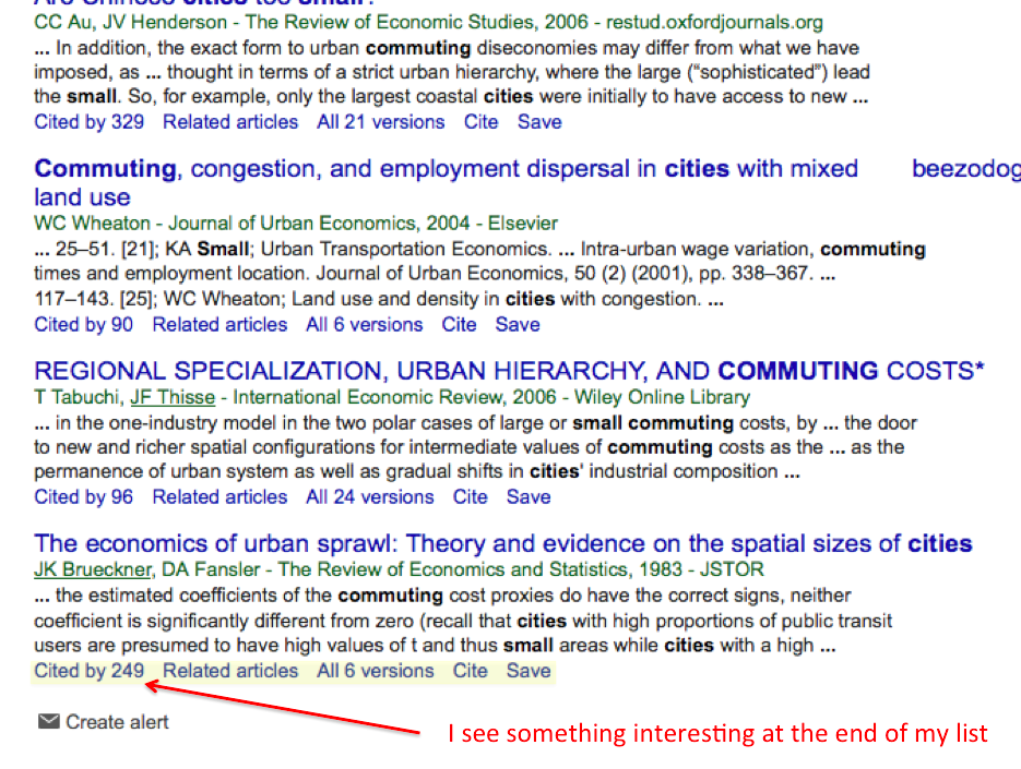 この中にも有望な記事が見受けられます。‘wasteful commuting(仮訳:無駄な通勤)’の考え方は補足的に役立つかもしれません。ひっかけ検索では、思わぬ掘り出しものが見つかる可能性があるので、辛抱強く情報を見ていくことがコツです。例えば、リストの末尾に見つけた‘the economics of urban sprawl(仮訳:都市のスクロール現象における経済性)’はかなり引用されていることが分かります。どんな人がこの記事を読んでいるのでしょうか。