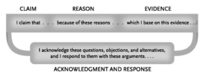 この3つのパーツのつながりを支えているのはBoothらによって示された「確認と応答」と呼ばれるライティングの形式です。基本的に段落には、読者の疑問、反論、論点に対する代替え案を想定していることを示す文章を入れ込んでおく必要があります。Boothらの言葉を借りると以下です。