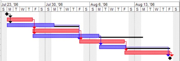期日を守るための適切な訓練を受けていない、というのが一つの理由でしょう。大学としては、博士課程まで進んだ学生は、しっかりしていて、頭の中も整理された状態で作業ができて当然だとみなしているのだと思います。これはかなり雑な決めつけです。例えば学生当時の私の専門分野は建築でした。学部生だった5年の間に建物を建てるためのプロジェクト管理について学んできたと思われるでしょうけれど、実際のところは、ほとんど何も教わりませんでした。プロジェクト管理の手法を覚えることができたのは、建築事務所に出入りをしていた10年ほどの間です。例えば、プロジェクト管理や生産管理に用いられるガントチャートの使い方を学ぶことができました。ガントチャートとは、下図のようなプロジェクトの各タスク(工程)のタイムラインを可視化するものです。
