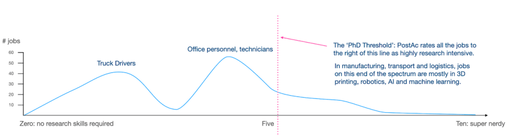 求人広告を、研究能力が不要な「0」から、高い研究能力が必須となる「10」までに分類してランク付けしています。製造業、運輸・物流業では、トラック運転手(研究能力は不要)から、事務職や技術者(研究能力を活用しながらもそれをクリエイティブに使うわけではない仕事)、そして少ないながらも増加している博士号レベルを超えた能力が必要な職種までが示されています。これらの業種を詳しく見ると、3Dプリンターやロボット、AIに関わる仕事がたくさんあることがわかります。