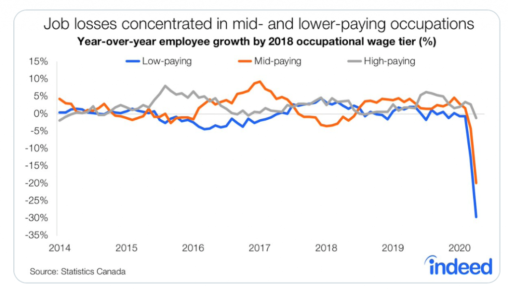 私は、PhDを止めるべきだ、などと言うつもりは全くありません。PhD取得後に学術界から離れて他の分野で活躍している人には、高い所得を得ている人もいることを伝えたいのです。高所得者ほど、不景気の時に失業する確率は低くなります。あるツイッターに出ていた下のグラフを見てください。これは過去2週間における複数の国の失業率の推移を分析したものですが、高所得者の失業率は1.3%しか下がっていないのに対し、中・低所得者の失業率は急下降したことが見て取れます。